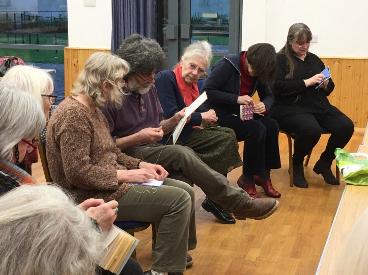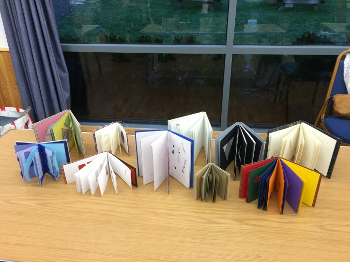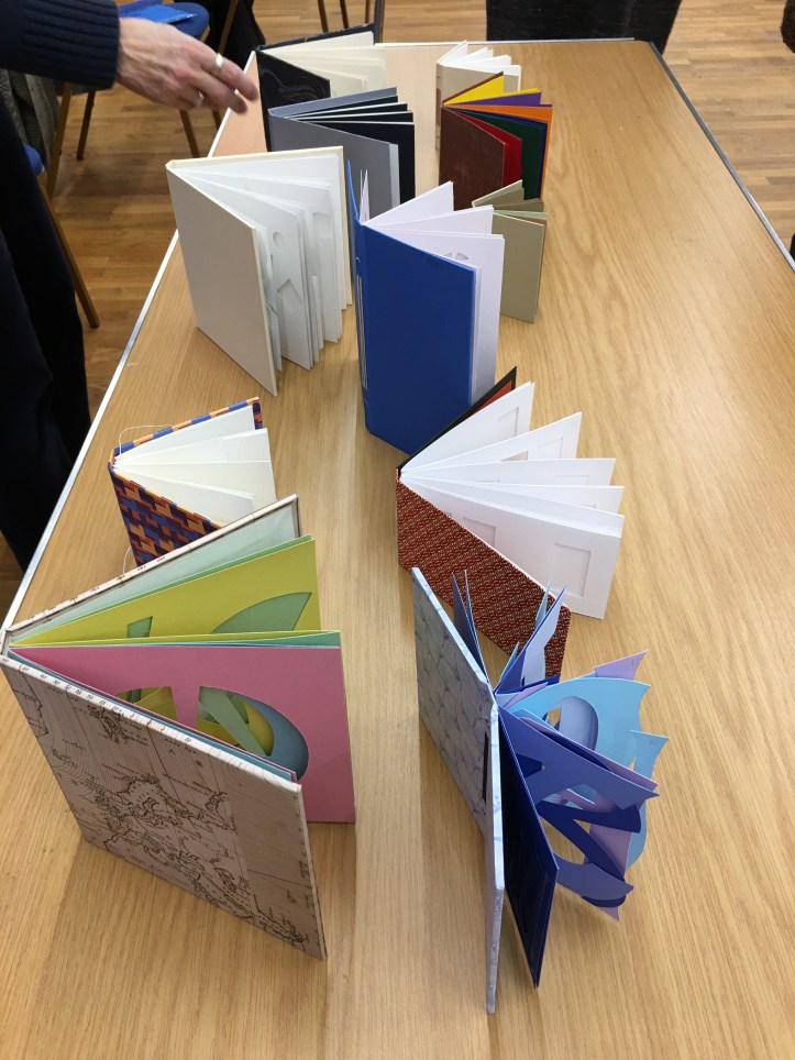 Such an enjoyable workshop with Andrew Morrison looking at Dynamic Sequences. This entailed making a 16 page book with hard cover and spine. The content of the book had to be a cut-out sequence of thought, either a chunky progression of letters from the alphabet, a series of rotating shapes, a developing story or a numerical sequence. Andrew left the fun bit till last when we sat round and he talked us through sewing the binding, without dropping our carefully ordered pages on the floor. We each went home with a satisfying little creation.