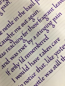 Nine of us braved Storm Dennis to join Nick Caulkin, who wisely came by train, for a relaxed workshop learning and practising Humanist script. Nick talked us through the history and development of this calligraphy hand and then we sat down to try it out. Starting with a large nib size we got to grips with the letterforms and then reduced the nib size to write out a piece of text.