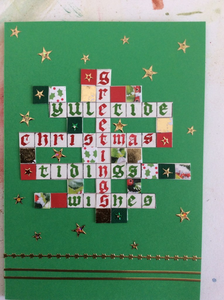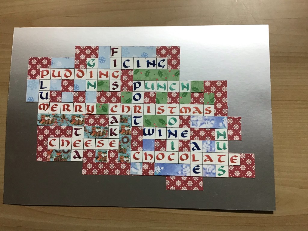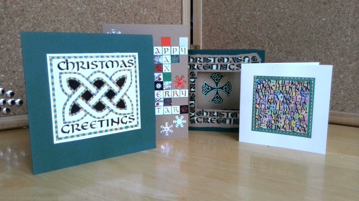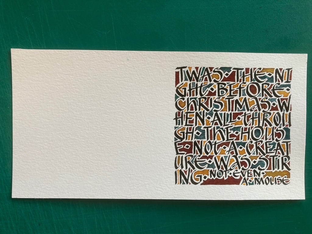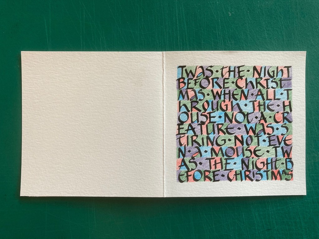 These lovely cards were made by those who attended our online workshop for members on 17th October with Vivien Lunniss. She took us through the steps to create unique greetings cards using designs with a festive theme exploiting the textural, decorative qualities of pen lettering. The Uncial hand lends itself very well to these techniques. We practiced writing in squares for a crossword effect, or stacking words together and using different ways to colour the negative space around the letters. Further decoration can be added by cutting printed paper, or using stamps. Cards made this way can be adapted to any other celebration.