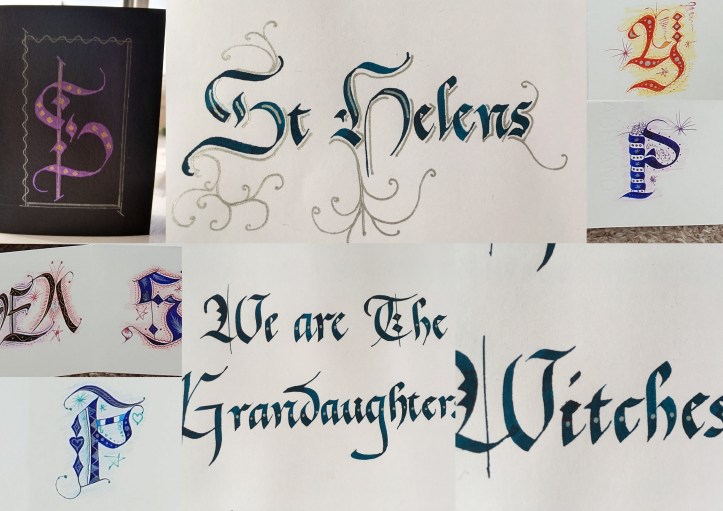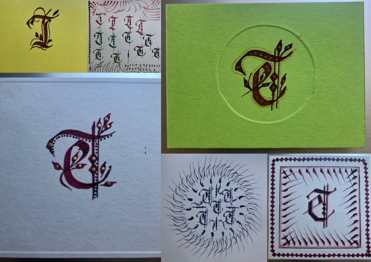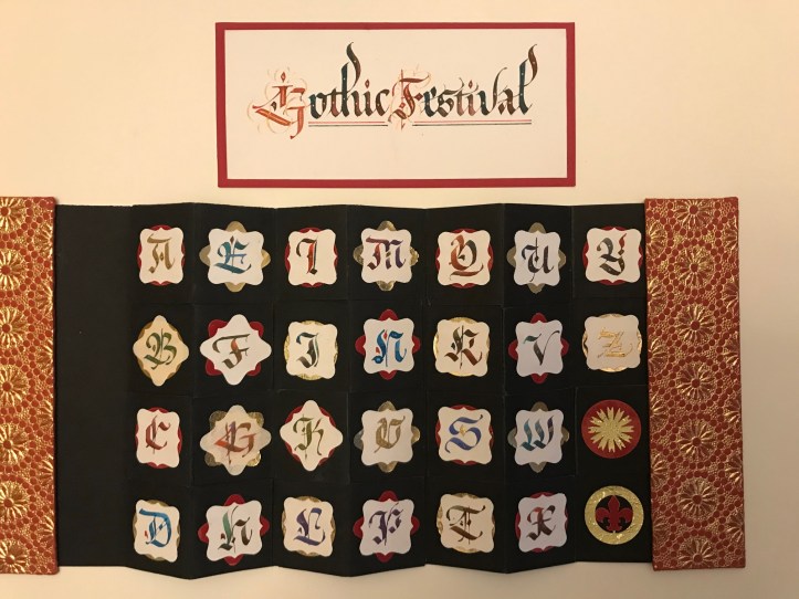 Barry Morentz actually attended one of our own workshops at Highnam with Rachel Yallop four years ago while he was over here doing research work. He is well known in the US for teaching his famous Pointed Modern Gothic script. On 20 March, he did a special workshop by Zoom introducing us to how Gothic Capitals are constructed and to ways of designing our own. How exciting – especially as there are hundreds of models and it’s always difficult to fit capitals to lower case scripts. The idea of looking at his exemplars of variations and the building block marks was to have fun with our own versions of Gothic Capitals. This was not a lesson in exact historic copies. Go wild, dress them up – use gel pens or gold gouache to add sparkle. The capitals are great for those special cards when you need a bit of a jazzy style and bling. They can be matched up with more sober black (or other colours) gothic miniscules.