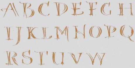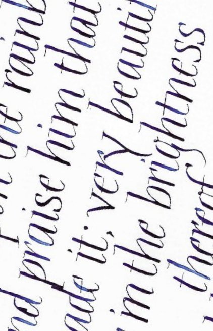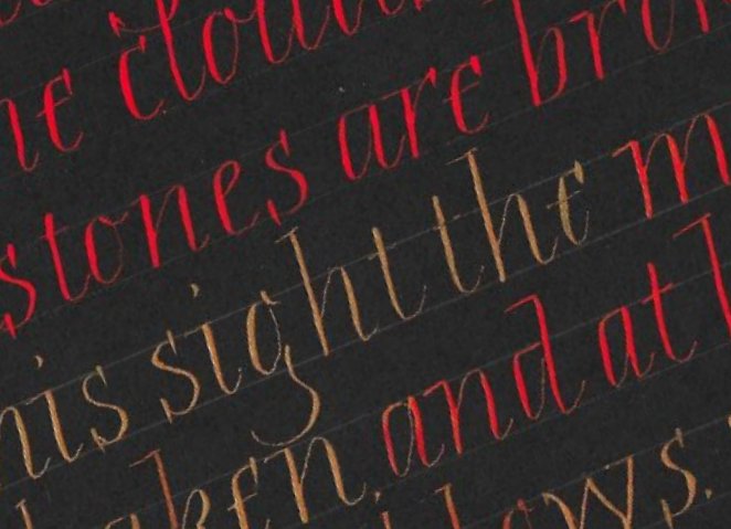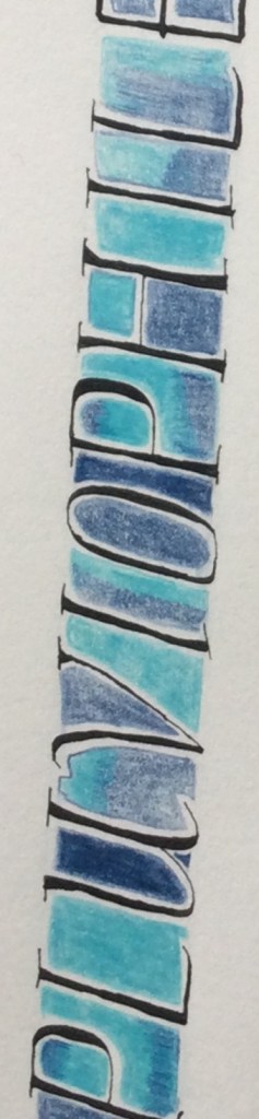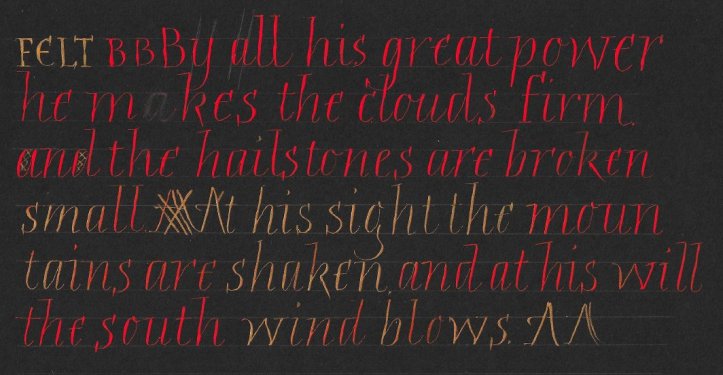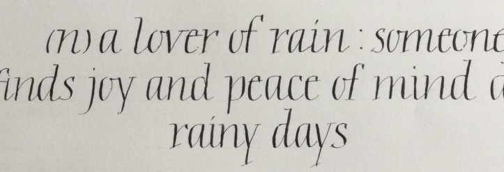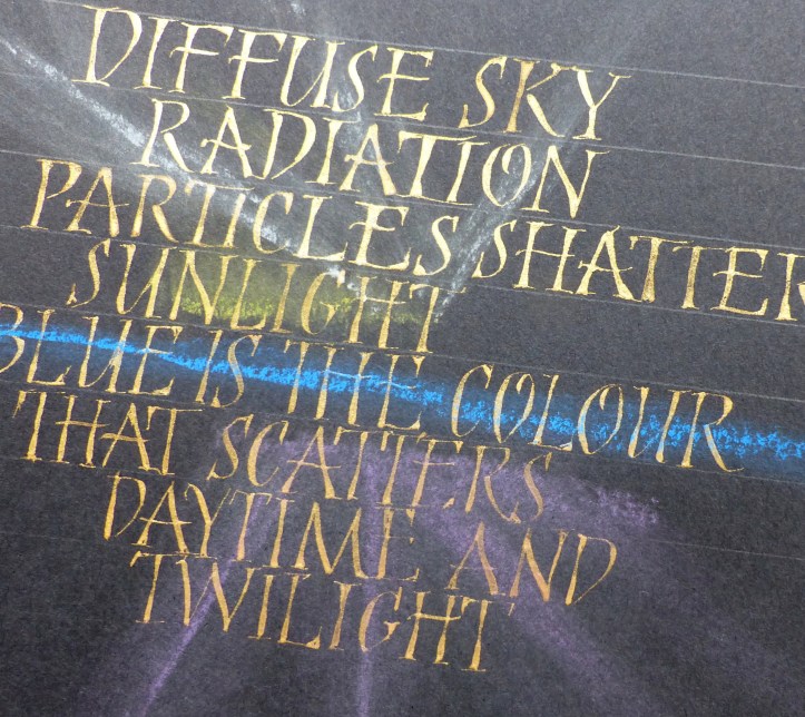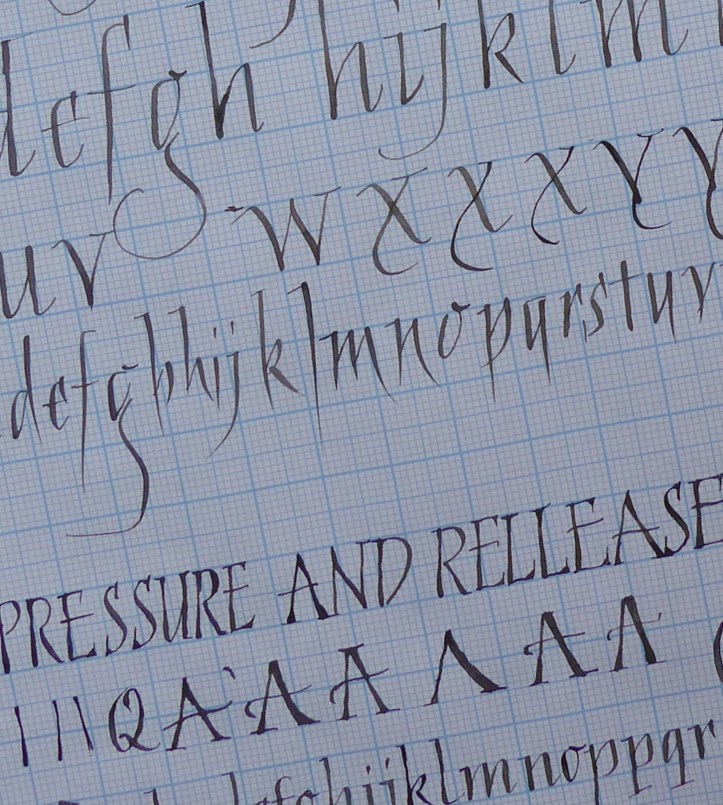 We had such a good time with Mary – friendly but firm advice about still minding our Italic arches and forms as we now tried pointed pens with pressure and release. We were reminded to keep the nib-holder pointing at us, not off to the side, to draw the nib towards you. Otherwise, you might apply too much pressure to one side of the pointed nib and wear it away unevenly. That will make it scratch unforgivingly. And if you do hear it scratch then you must pay attention (!) and give that nib the heave-ho. Don’t ignore it because it will sputter on the fine upstroke and probably splay out on the downstoke, not releasing the ink properly. And some of us related later that we had indeed needed to change an old nib. One technique is to hang the minuscule forms from the top line and allow the nib to lift off as the pressure is released, resulting in a pleasing irregularity and impression of speed. We watched Mary write capitals with extra strokes top and bottom to thicken up the form ever so slightly for that elegant touch, with beautiful thin serifs. Quick double strokes give an open versal effect too. A little pastel helps lift the piece. Some shading in the negative space is not only effective as decoration but will quickly show how you are managing with spacing and help train your eye.