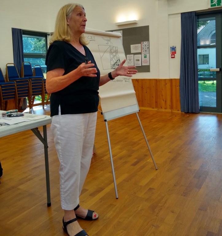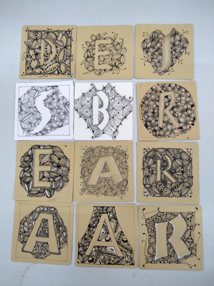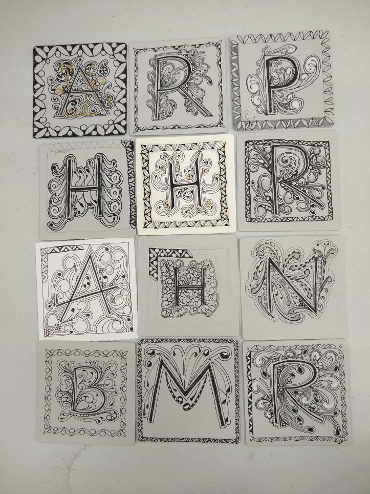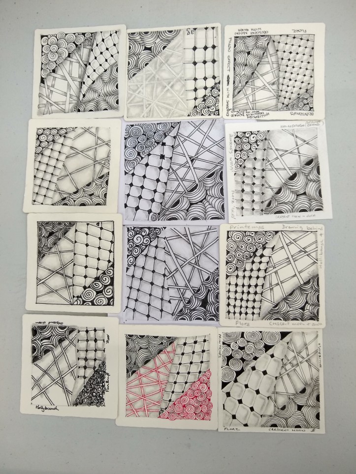 Sheila Murray showed us how to create zentangles in this workshop on 18th September. She started the day with the history of Zentangle created by Maria Thomas and Rick Roberts, a couple from the U.S. The art Maria produced in these small “tangled” formats immersed her in a meditative state. Sheila asked us to relax and switch off for a few minutes before starting her demonstrations which led us each to produce 3 pieces of Zentangle. A marvellous relaxing day.