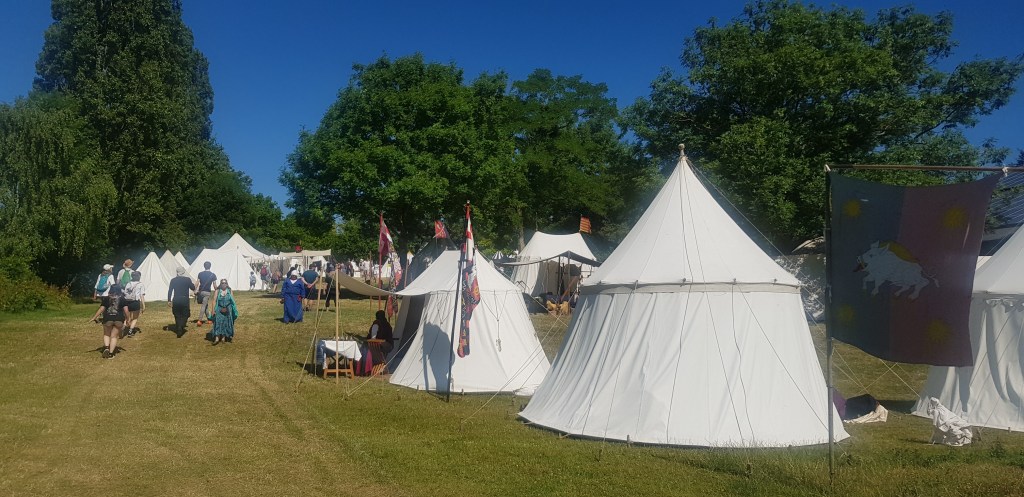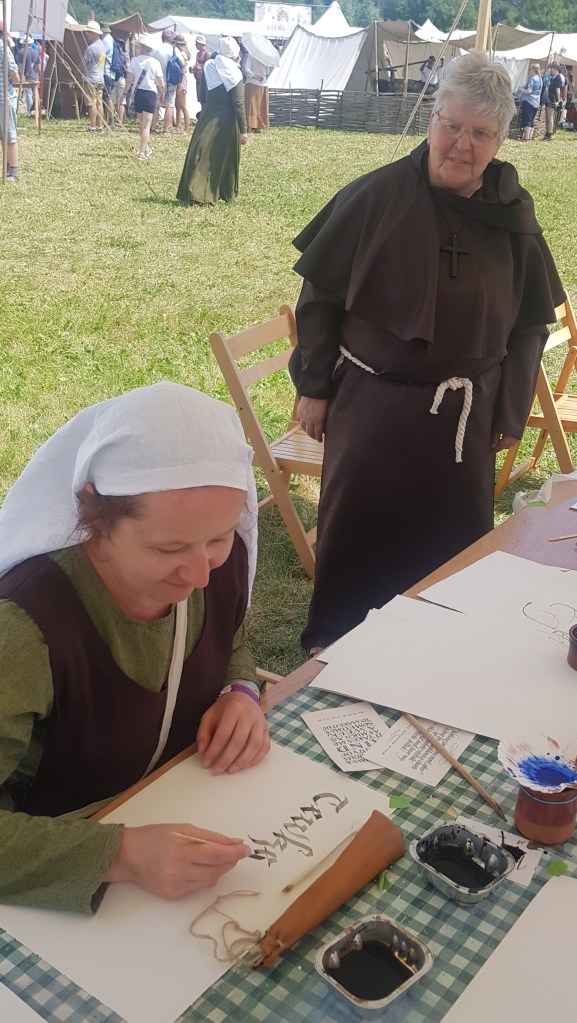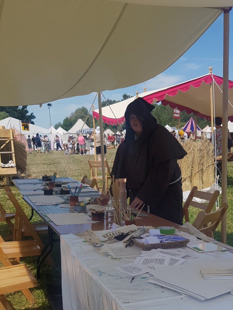 GLA volunteers were in attendance all weekend at the festival, dressed appropriately in ‘authentic’ polyester habits, giving calligraphy demonstrations in the Heritage Crafts area. In sweltering heat and being on their feet all day wasn’t easy but our brave scribes encouraged onlookers to join the table and try a simple script. The people who took part were very interested in the writing technique and giving it a go. Hats off to Jean who manned the tent all weekend and to the rest of the volunteers.
