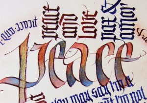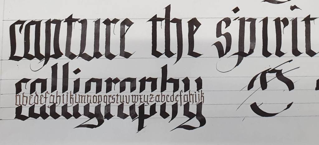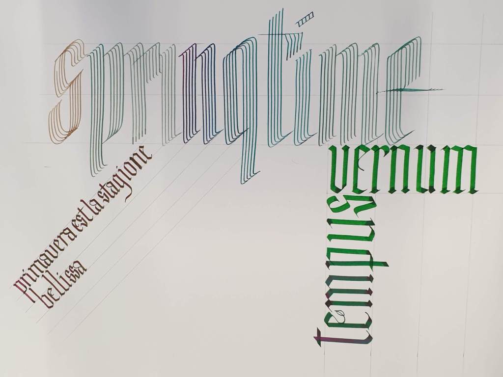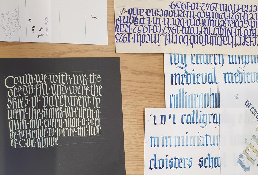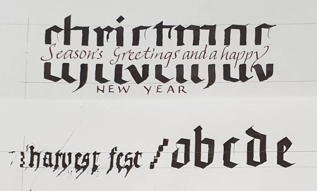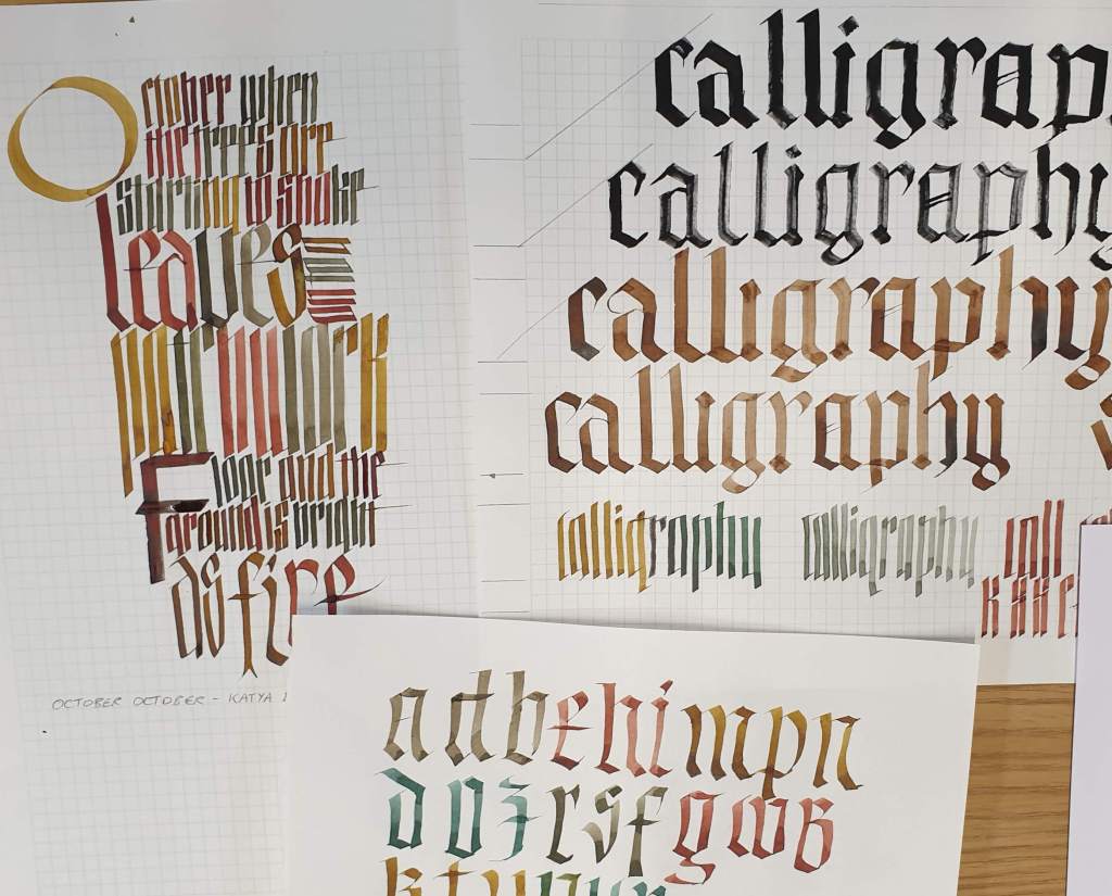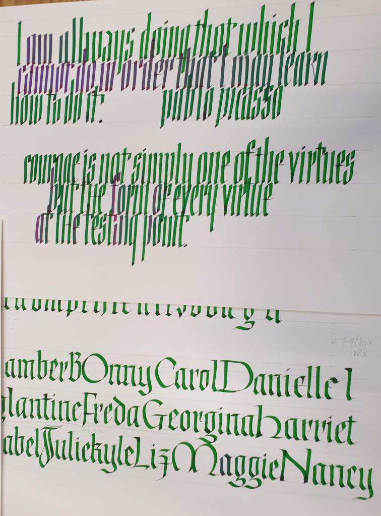 We had renowned SSI/CLAS Fellow Vivien Lunniss visit us in October to teach a wonderful workshop using a refreshing approach to Black Letter – not the usual Gothic Textura as you’d imagine. But funnily enough that is what we started with to remind us of a classic style. Swiftly moving on, we studied examples of work by Ward Dunham and Friedrich Neugebauer, who took two very contrasting approaches to breaking the stereotype of Black Letter. Taking some of their forms as our models we wrote the alphabet and then words to achieve dramatic interpretations of words. We had to solve letter clashes or create a letter we had no example of. And we moved away from Black to Glorious Colour and put our version of the two styles together. This was such fun to do.