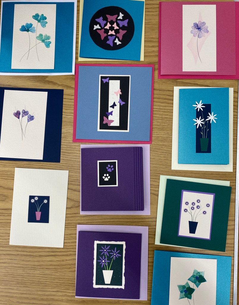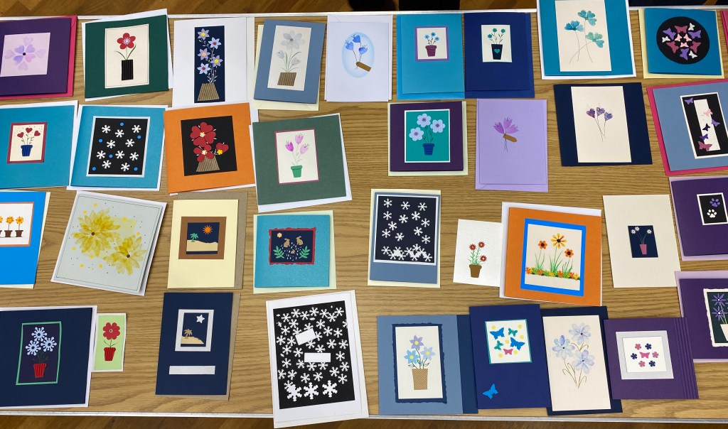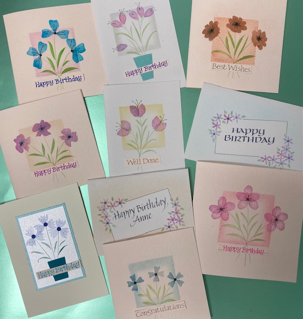 DECORATIVE TECHNIQUES FOR CARDMAKING – A really enjoyable day was had by all attending this lovely session with Joy and her sister Wendy. We made lots and lots of cards with so many different techniques and ideas. Creating our own rubber stamps gave us such a unique design for our cards enhanced with pointed pen stems and leaves. The photos show such a variety of our own making.