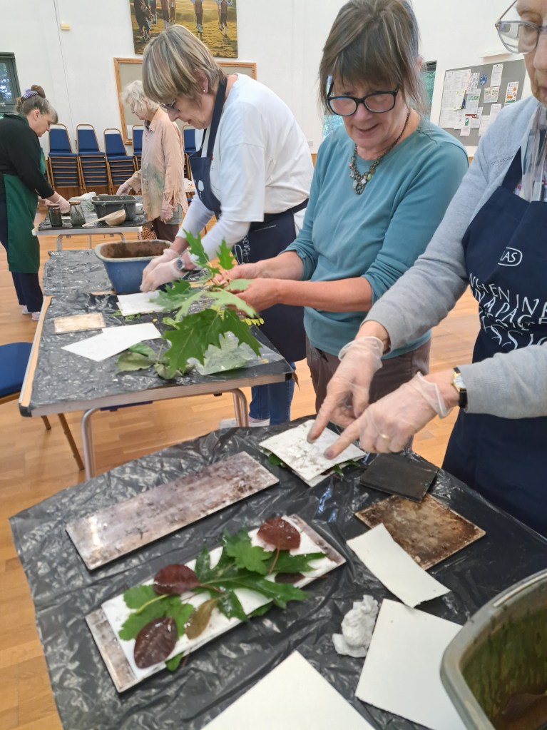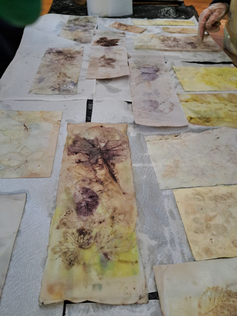 This was such a rewarding day. Discovering ways of printing with leaves in ways which I could never have imagined. The most surprising things – who knew that soaking leaves in iron water makes them leave an imprint on paper! Iron water is exactly water that has had rusty bits of metal, nails or screws steeped in it. And who knew you could then “cook” the paper in large pots of simmering water! Lizzie kept warning us not to let the water boil. What fun! What joy! Came away with a happy heart and a bagful of ideas.