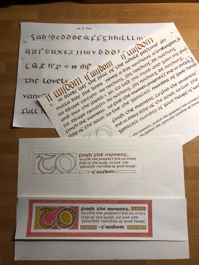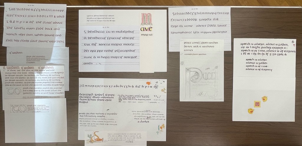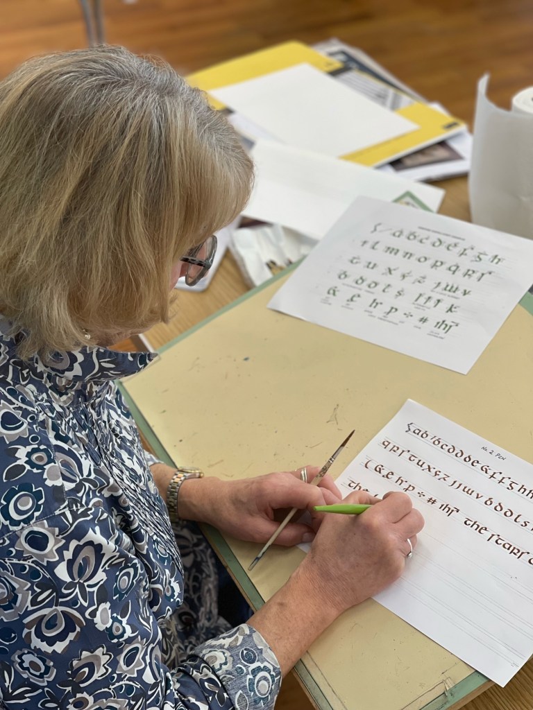Peter began the day with an explanation of how he imagines the original scribe approached the task of writing the Hereford Gospels, sharing the clues found in the book and its constituent ‘gatherings’ and how one might interpret them. Peter’s gentle yet evident passion for his subject set us up really well as we explored the script together and moved on to develop our own designs. A wonderful and calming day.