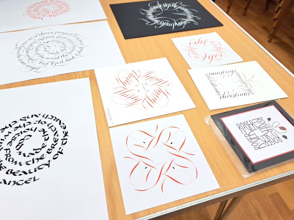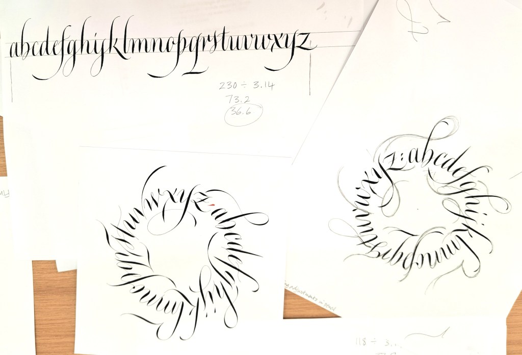 We then moved on to writing around circles, using a maths formula to calculate the radius and ensuring accurate spacing. Finally, we created spirals with compasses and rulers, crafting text that flowed seamlessly outward while maintaining alignment. Rachel’s expert guidance and personal attention made the day both inspiring and highly enjoyable.