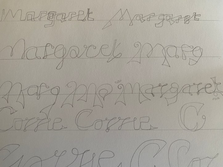 A really interesting afternoon playing with continuous lines. Starting with one square frame and filling it continuously with A-G letters. Experimenting with what letter forms that would give us. We proceeded with creating interesting letters and words while we worked along with Julie. She had a wealth of inspiration and interpretations of this technique from early cave drawings to well known artists.