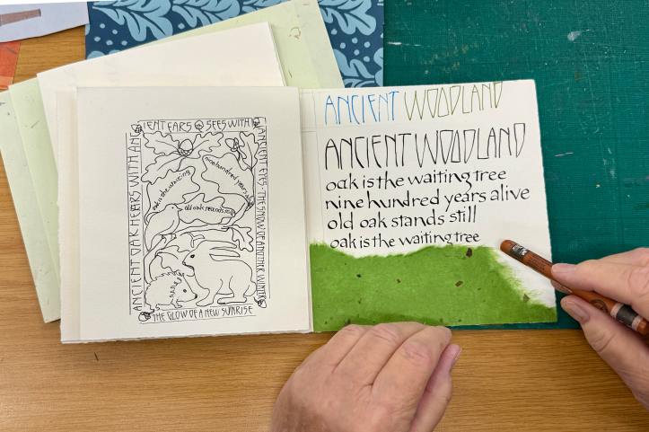 During our workshop with calligrapher Margaret Morgan, we explored creative ways to breathe new life into our accumulated piles of practice sheets and treasured scraps. Inspired by her own need to rationalise her studio space, Margaret guided us in transforming these forgotten pieces into beautifully bound books. With design theory at the heart of her approach, she encouraged us to look beyond the obvious, to play with contrast, continuity, and unexpected juxtapositions, turning discarded fragments into thoughtful compositions. The process of selecting and arranging was as important as the binding itself—challenging yet deeply rewarding—and offered the promise of creating unique memory books that delight the eye while reclaiming precious space on our shelves.