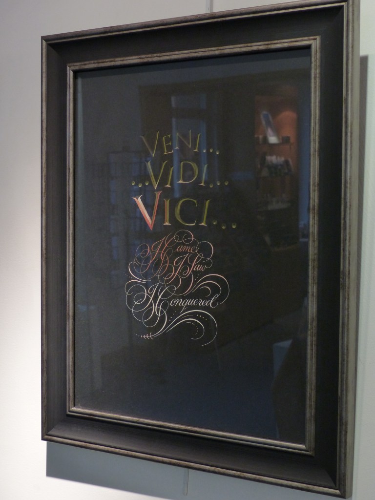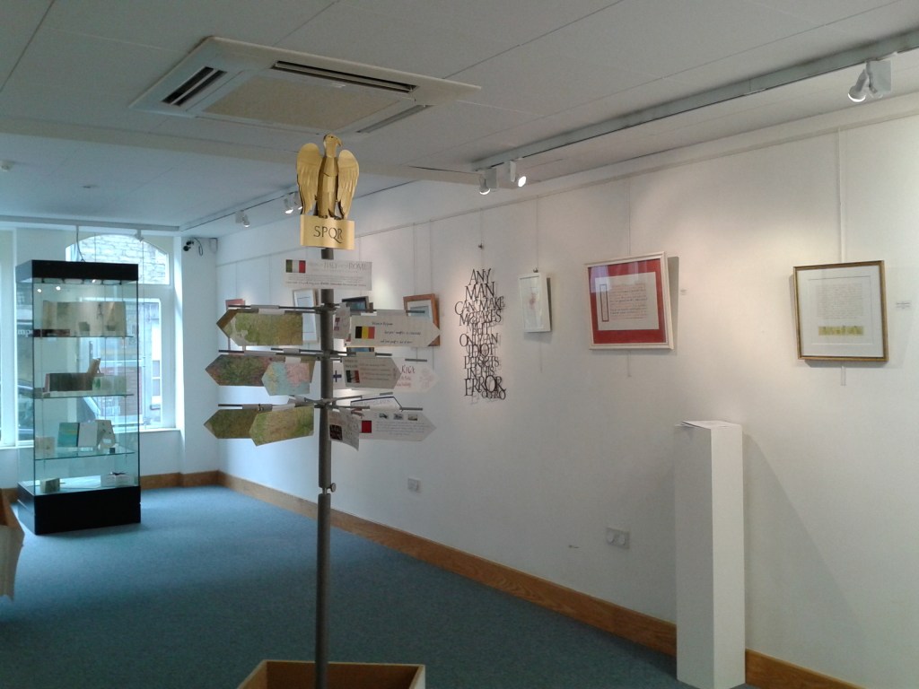 For a month, from St Valentine’s Day to the Ides of March, we showed our work in Cirencester. Taking the proverb as our theme, we had fun letting our imagination roam. Signposts to European countries with advice on what to see or do when there – or reworking Roman lettering and ancient quotes.